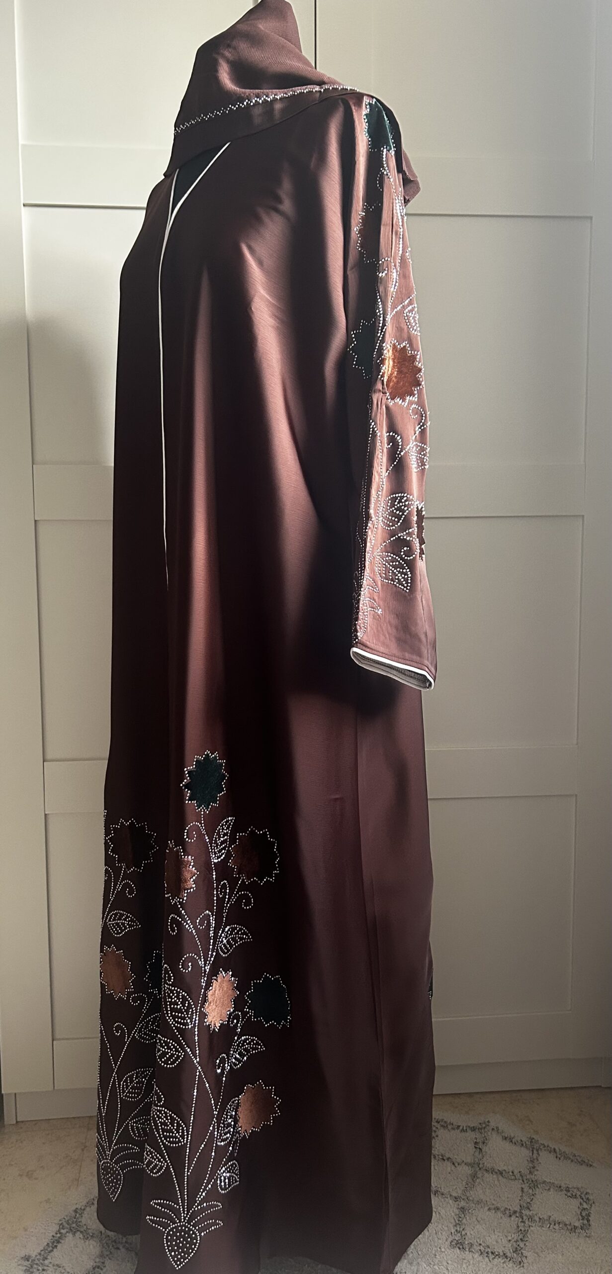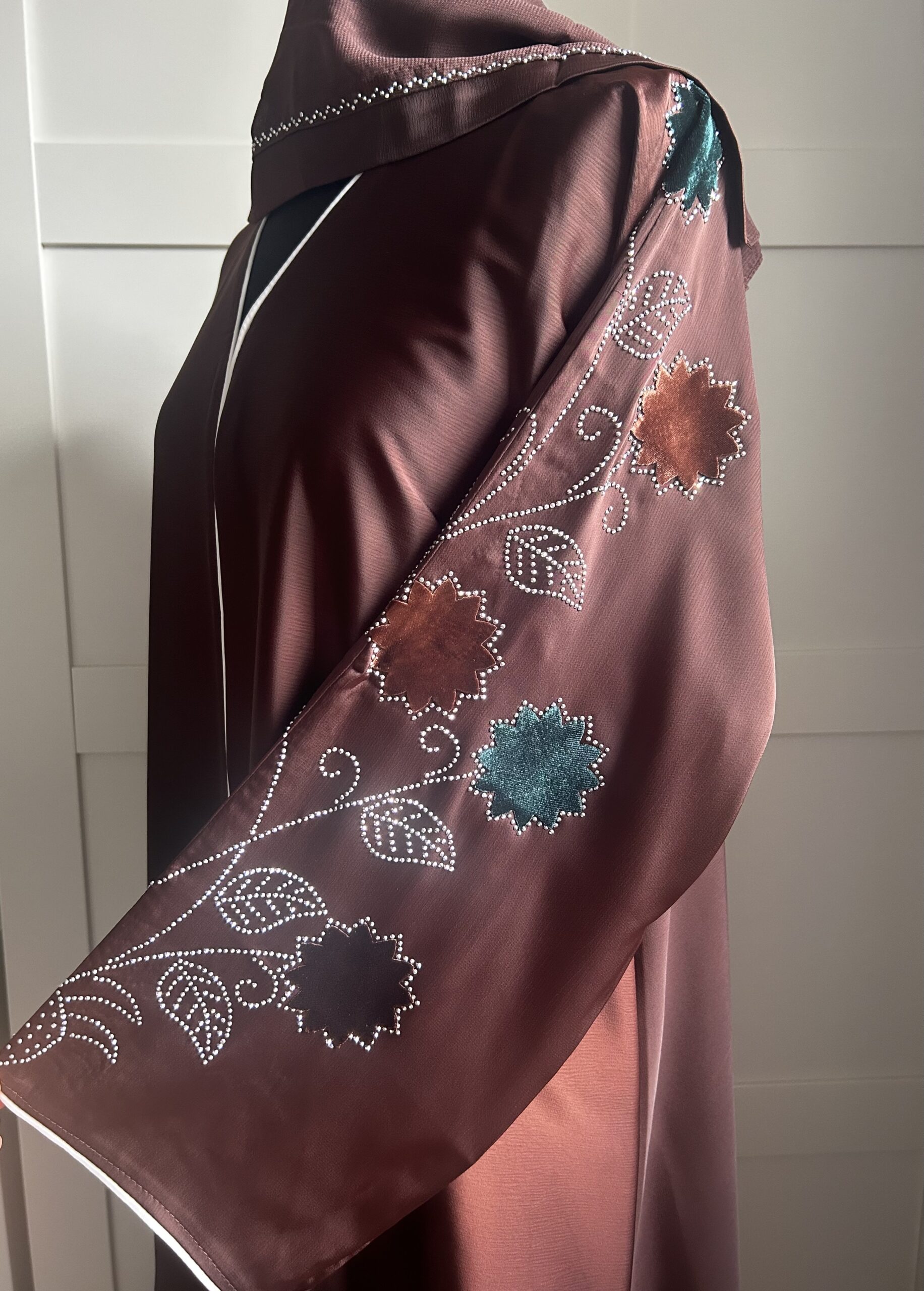 Notre sublime abaya Dubaï LOUISA marron, délicatement embellie de strass scintillants qui dessinent de magnifiques fleurs élégantes remontant depuis le bas de la pièce. Les manches sont également ornées de ce motif délicat, offrant une harmonie parfaite et un éclat raffiné à chaque mouvement.